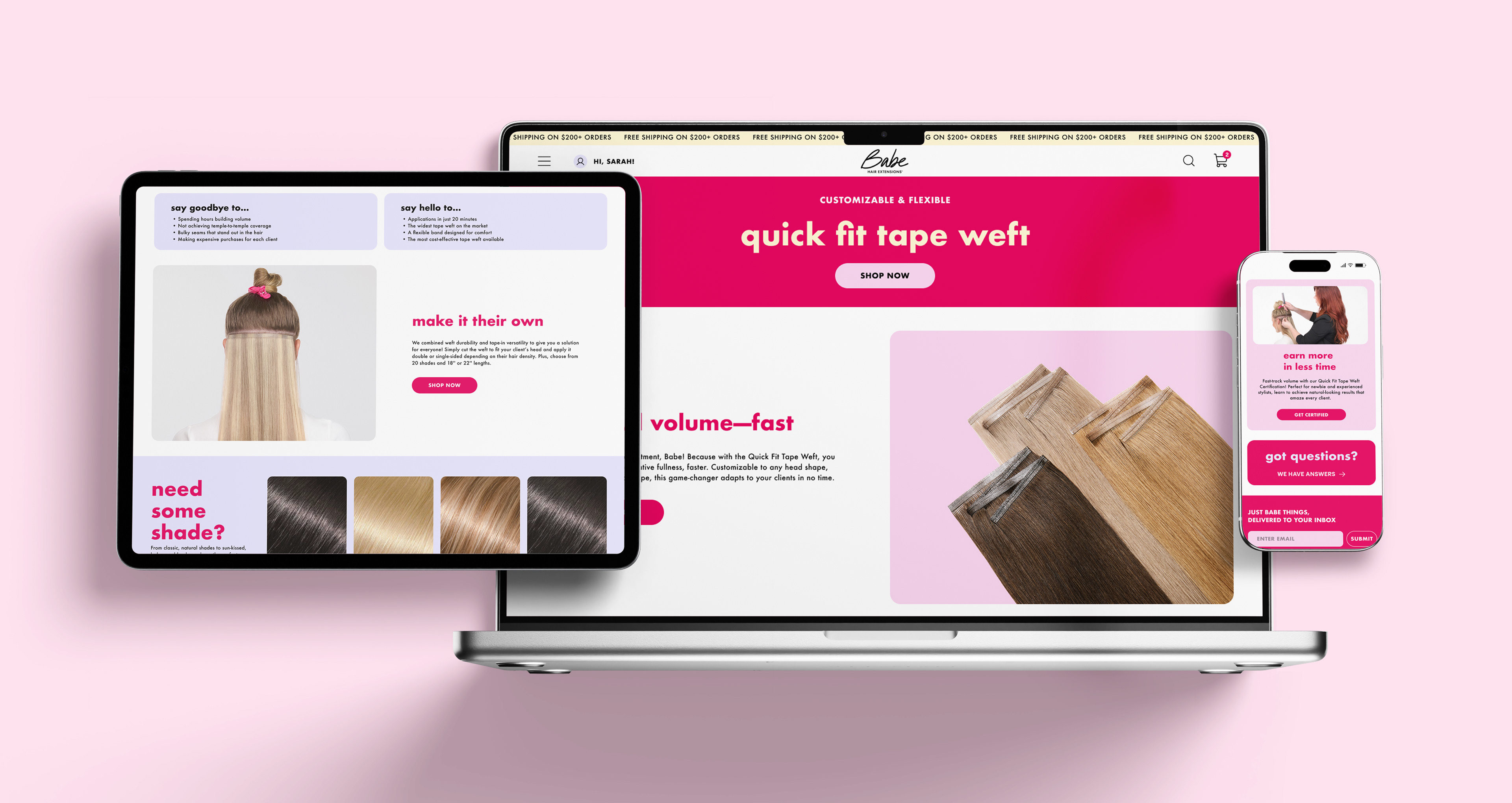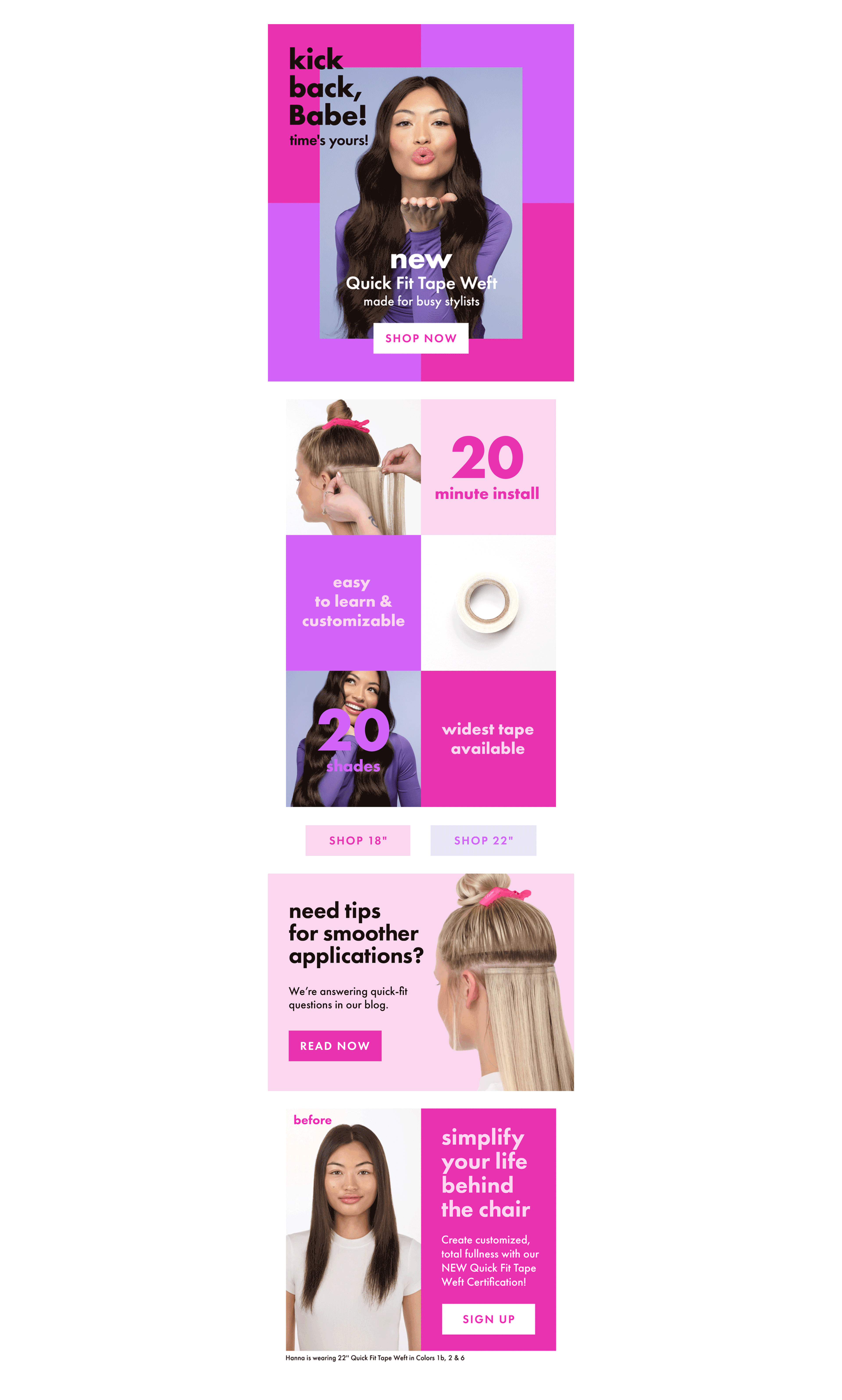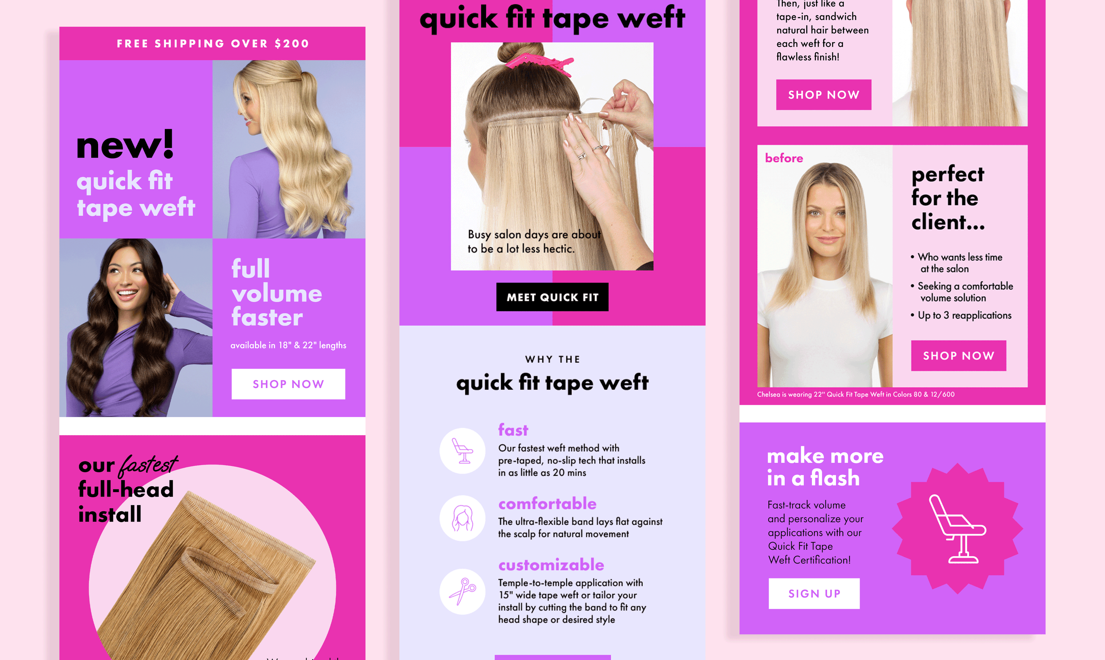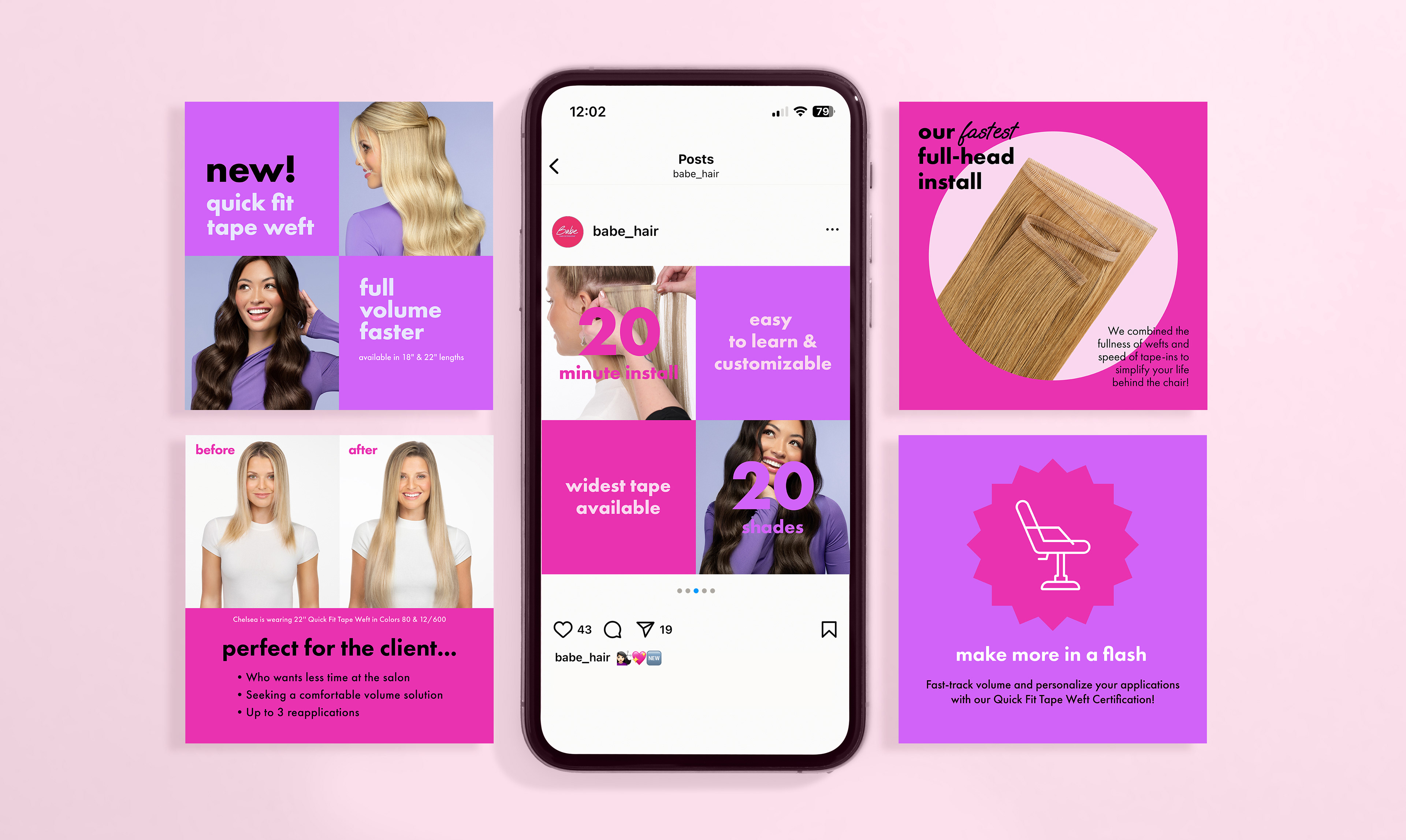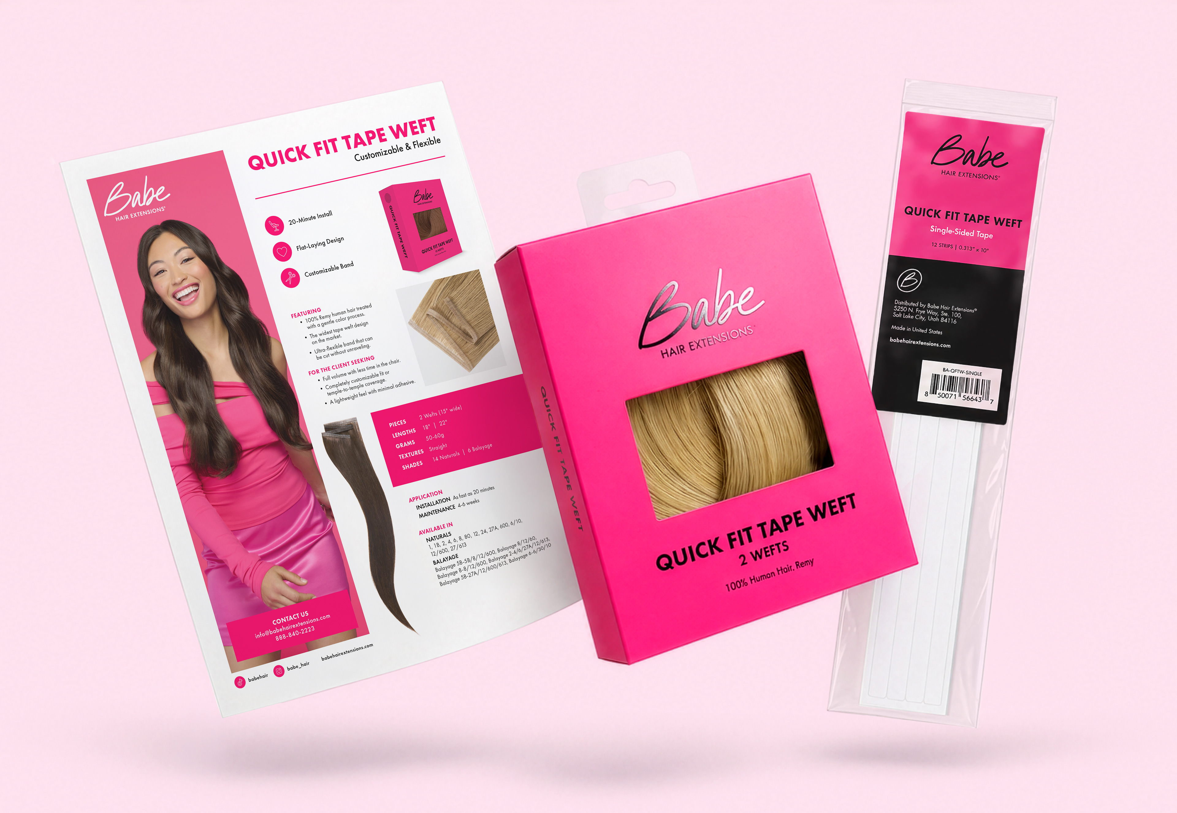 For the launch of Babe Hair Extensions’ Quick Fit Tape Weft, a bold campaign was created to reflect the product’s fast, customizable approach to achieving full volume. Combining the durability of wefts with the versatility of tape-ins, the product is designed to adapt to any client and hair type. I contributed to the design of a cohesive set of launch assets, including but not limited to a sell sheet and packaging, printed materials, social media graphics, an email series, and a dedicated landing page. To help the launch stand out, we introduced a vibrant fuchsia and purple color palette, resulting in a visually striking campaign that emphasizes speed, flexibility, and transformation across every touchpoint.